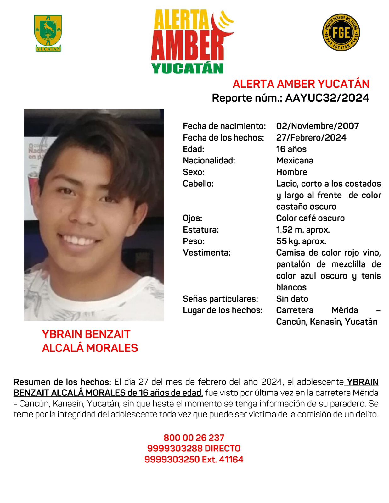 Mérida, Yucatán., 28 de febrero de 2024.- La Fiscalía General del Estado (FGE) realizó la activación de alertas Amber para la búsqueda y localización de dos adolescentes desaparecidos en Yucatán.