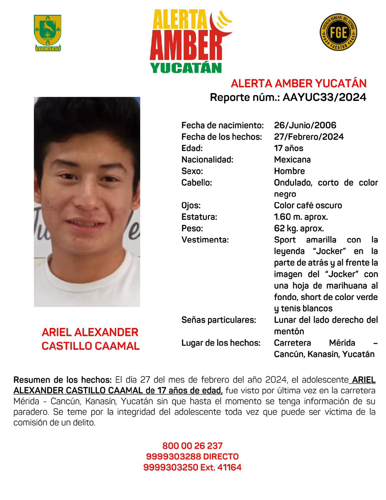 Cualquier información sobre el paradero de los adolescentes llamar al 800 00 26 237,  9999303288 Directo o 9999303250 Ext. 41164