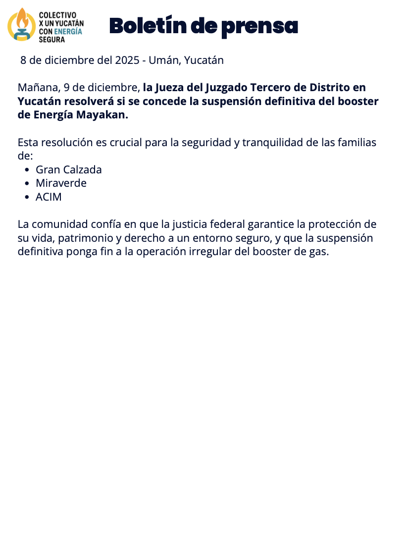 Este hallazgo administrativo se da en vísperas de una resolución judicial crucial. Este martes 9 de diciembre, la Jueza del Juzgado Tercero de Distrito en Yucatán resolverá si se concede o no la suspensión definitiva de operaciones del booster de Energía Mayakan, medida solicitada por la comunidad mediante un amparo.