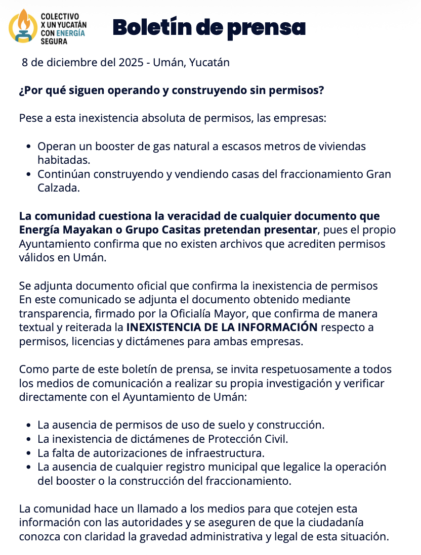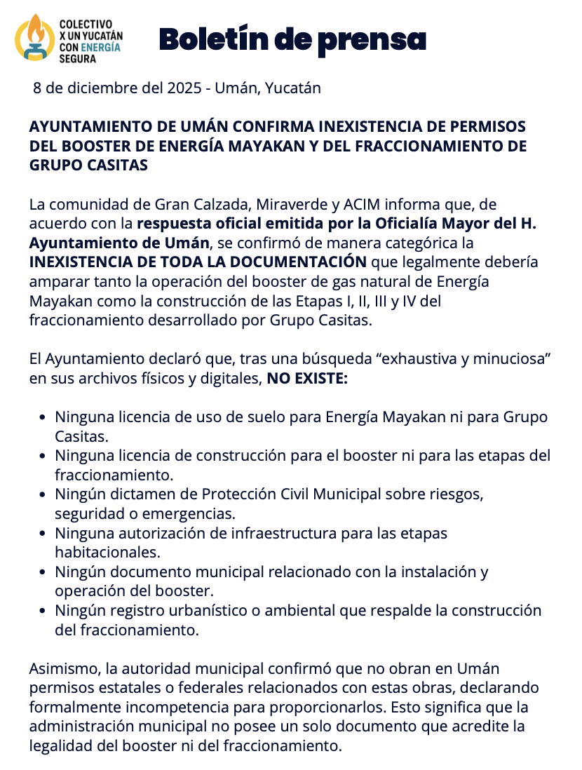 Umán, Yucatán, 8 de diciembre de 2025 – La Oficialía Mayor del H. Ayuntamiento de Umán emitió una respuesta oficial que confirma la inexistencia de toda la documentación municipal requerida para legalizar la operación del booster (estación de compresión) de gas natural de Energía Mayakan, así como de las cuatro etapas del fraccionamiento «Gran Calzada» desarrollado por Grupo Casitas.