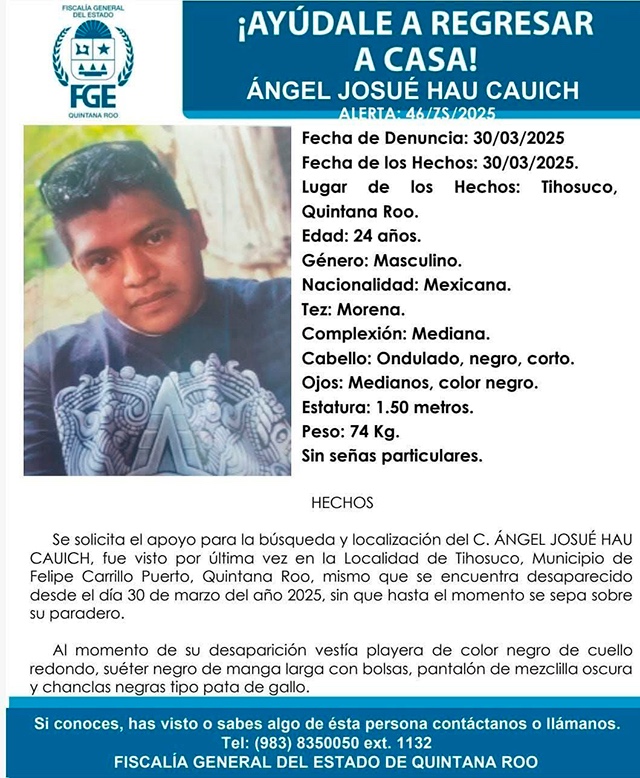 Por la desaparición de Ángel hay una ficha de búsqueda vigente. Aunque Jacobo fue arrestado por este delito aún no hay más detalles del paradero del joven de Tihosuco, Felipe Carrillo Puerto.