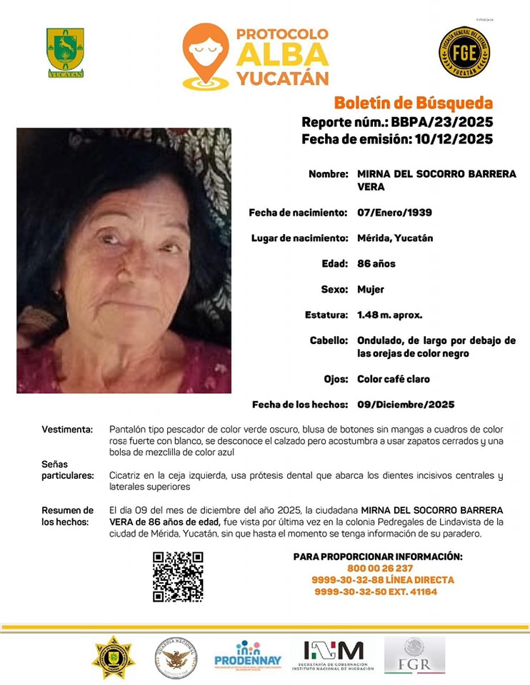 Mirna del Socorro Barrera Vera de 86 años de edad desapareció el 9 de diciembre y su búsqueda continúa activa. La última vez que la vieron fue en la colonia Pedregales de Lindavista de la ciudad de Mérida.