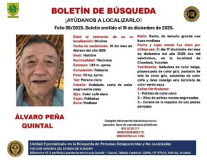 Mérida, Yucatán, 15 de diciembre de 2025.- En Yucatán tres personas adultas mayores desaparecieron en las primeras dos semanas de diciembre. Luis y Raymundo ya fueron hallados, desafortunadamente, el segundo fue encontrado sin vida. Mientras que la búsqueda por Mirna continúa activa, su familia la espera en casa.